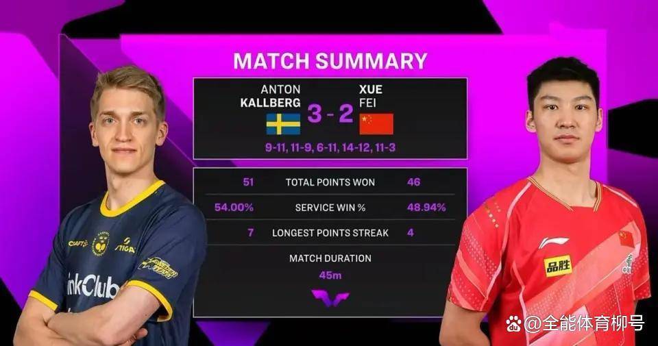然则,薛飞莫得收拢这个千载难逢的好契机,第一轮在与瑞典名将安东-卡尔伯格的比赛中,一度以2-1拿到赛点,但在手持绝佳好局的情况下,被敌手连扳两局,总比分2-3缺憾“一轮游”。而在第一轮的另一场焦点比赛中,小将陈垣宇挑战新科世乒赛冠军王楚钦。