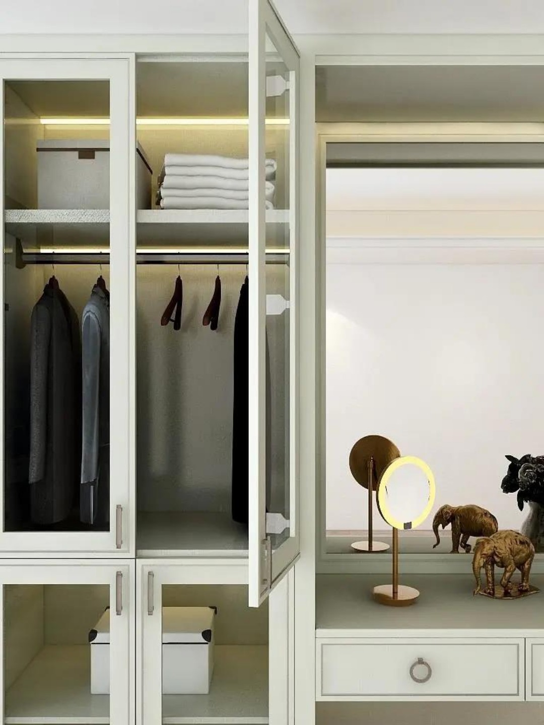 主卧衣帽间的衣柜结合妆台一体设计,